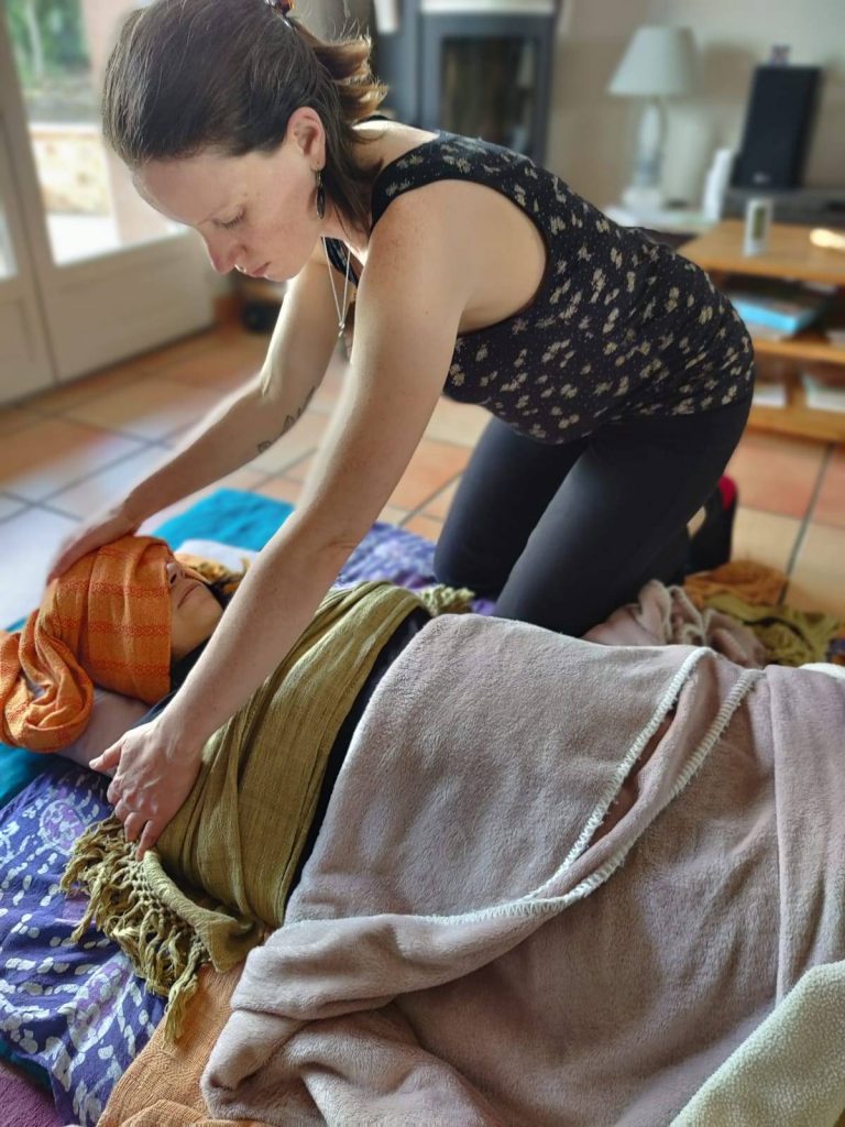 Le massage est accompagné d’un resserrage du bassin, pour t’aider à te recentrer, te contenir et refermer symboliquement cette étape.